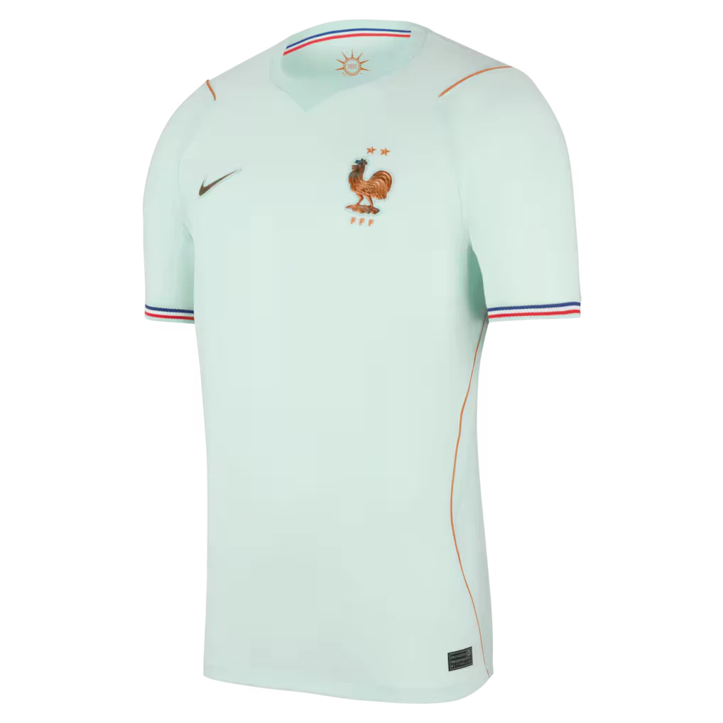 Le maillot adopte un vert distinctif avec des détails cuivrés et métalliques, rappelant la patine de la Statue de la Liberté. Les motifs FFF ton-sur-ton et le col polo reprennent les codes du maillot domicile pour une cohérence visuelle forte.